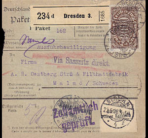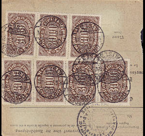 Auslandspaketkarte (5 000 g) vom 18.05.1923 frankiert mit 8 Marken a 3 000 Mark (=24 000 Mark)