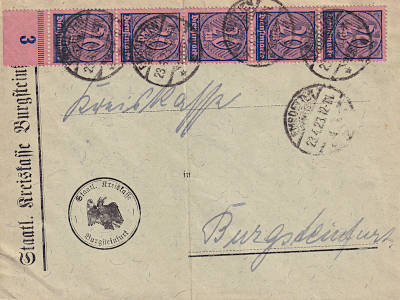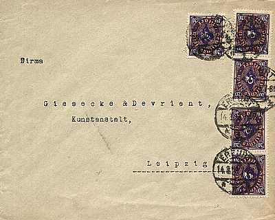 Inlandsbrief (1-20 g) vom 23.04.1923 frankiert mit 5 Marken a 20 Mark (=100 Mark) |