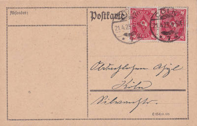 Ortspostkarte vom 21.04.1923 frankiert mit 2 Marken a 10 Mark (=20 Mark)