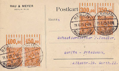 Ortspostkarte vom 11.06.1923 frankiert mit 4 Marken a 5 Mark (=20 Mark)