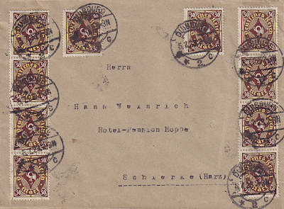 Inlandsbrief (1-20 g) vom 05.07.1923 frankiert mit 10 Marken a 30 Mark (=300 Mark) |