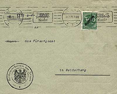 Inlandsbrief (1-20 g) vom 31.07.1923 frankiert mit einer Marke a 300 Mark (=300 Mark) |