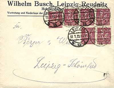 Ortsbrief (1-20 g) vom 12.07.1923 frankiert mit 6 Marken a 20 Mark (=120 Mark)