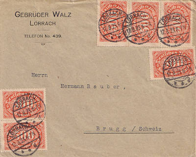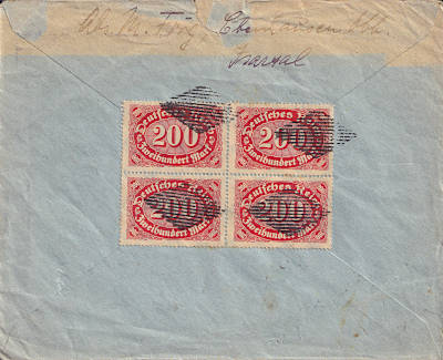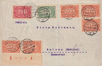 Foreign cover (1-20 g) from 11.08.1923 franked with 7 stamps (=3 000 Mark) |