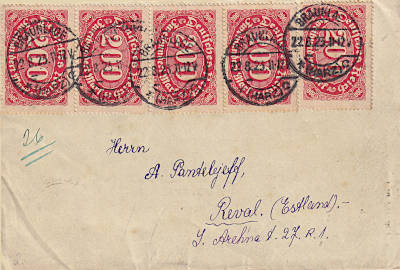 Foreign cover (1-20 g) from 17.08.1923 franked with 6 stamps a 500 Mark (=3 000 Mark) |