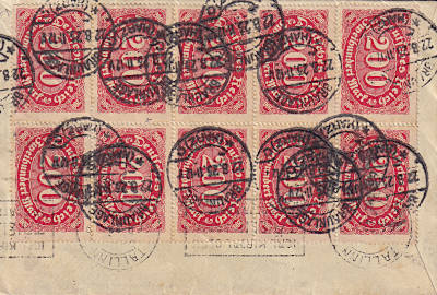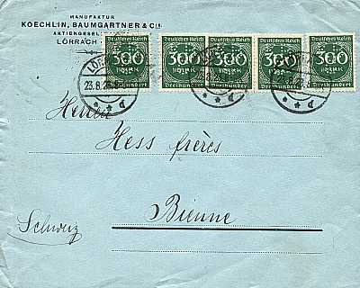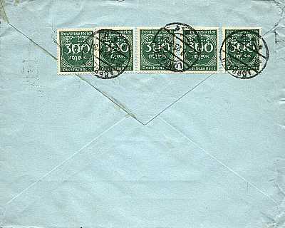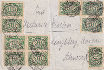 Foreign cover (1-20 g) from 07.08.1923 franked with 10 stamps a 300 Mark (=3 000 Mark) |