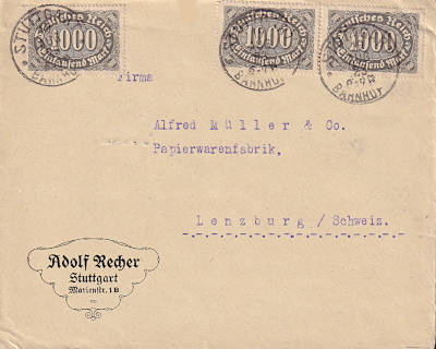 Foreign cover (1-20 g) from 19.08.1923 franked with 3 stamps a 1 000 Mark (=3 000 Mark) |