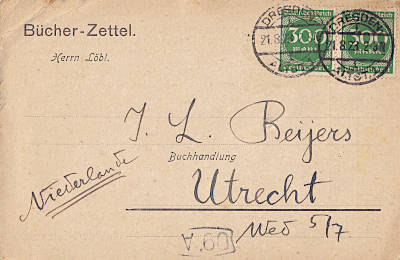 Auslandsbücherzettel (1-50 g) vom 21.08.1923 frankiert mit 2 Marken a 300 Mark (=600 Mark)