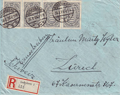 Auslandsbrief mit Einschreiben (1-20 g) vom 20.08.1923 frankiert mit 4 Marken a 1 000 Mark (=4 000 Mark, 3 000 Brief 1 000 Einschreiben)
