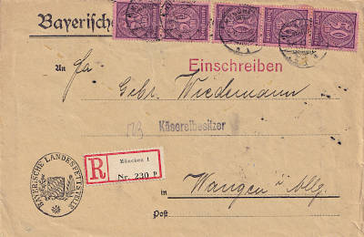 Inlandsbrief mit Einschreiben (1-20 g) vom 18.08.1923 frankiert mit 4 Marken a 500 Mark (=2 000 Mark, 1 000 Brief 1 000 Einschreiben) |
