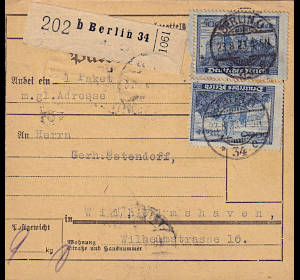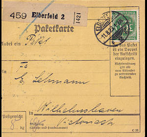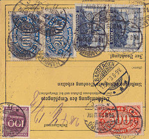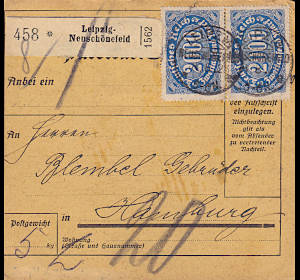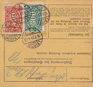 Inland parcel card (17 500 g, 75-375 km) from 14.08.1923 franked with 9 stamps (=27 600 Mark) |