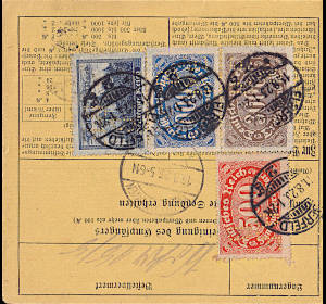 Inland parcel card (4 500 g, > 75 km) from 18.08.1923 franked with 5 stamps (=7 200 Mark) |