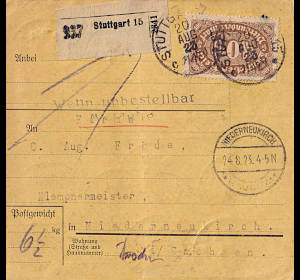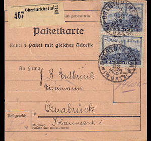 Inland parcel card (9 000 g, 75-375 km) from 23.08.1923 franked with 4 stamps (=12 000 Mark) |