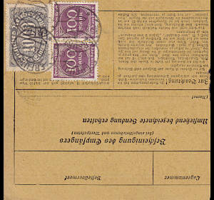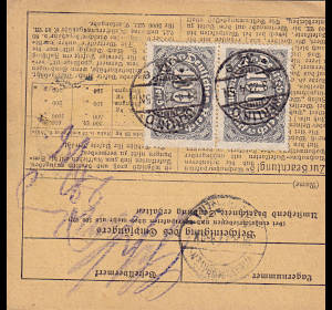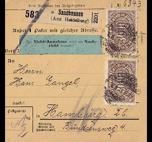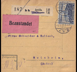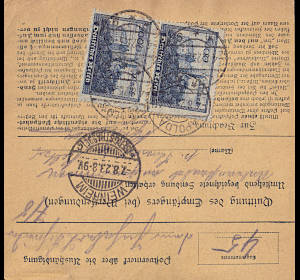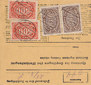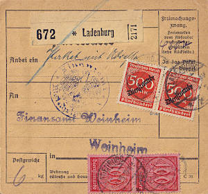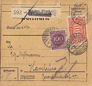 Inland parcel card (9 500 g, 75-375 km) from 20.08.1923 franked with 7 stamps (=13 200 Mark) |