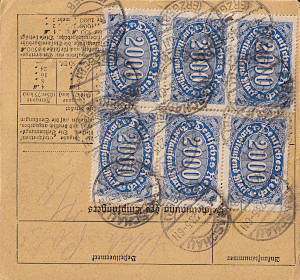 Inland parcel card (8 000 g, 75-375 km) from 11.08.1923 franked with 6 stamps (=10 800 Mark) |