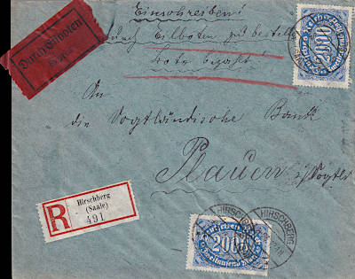Inlandsbrief mit Einschreiben und Eilzu- stellung (1-20 g) vom 03.08.1923 frankiert mit 2 Marken a 2 000 Mark (=4 000 Mark, 1 000 Brief 1 000 Einschreiben 2 000 Eilzustellung)