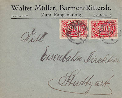 Ortsbrief (1-20 g) vom 22.08.1923 frankiert mit 2 Marken a 200 Mark (=400 Mark) |