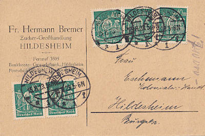 Ortspostkarte vom 15.08.1923 frankiert mit 5 Marken a 40 Mark (=200 Mark)