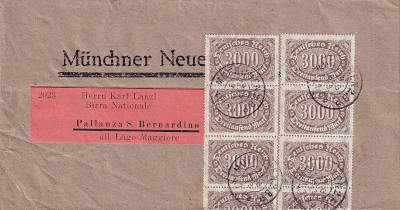 Auslandsdrucksache (1-50 g) vom 31.08.1923 frankiert mit 4 Marken a 3 000 Mark (=12 000 Mark)