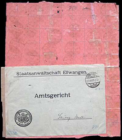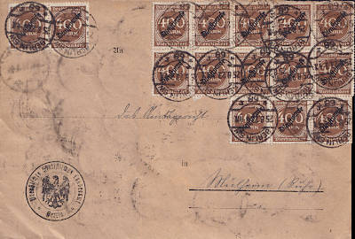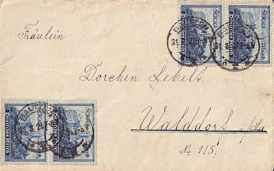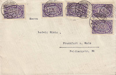 Inlandsbrief (1-20 g) vom 27.08.1923 frankiert mit 4 Marken a 5 000 Mark (=20 000 Mark) |