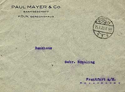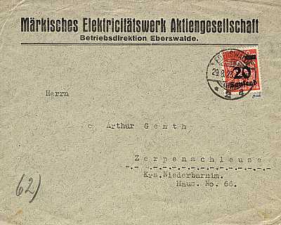 Inlandsbrief (1-20 g) vom 24.08.1923 frankiert mit einer Marke a 20 000 Mark auf 25 Mark (=20 000 Mark) |