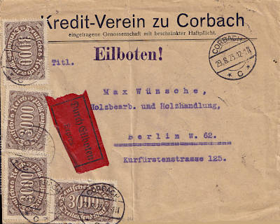 Inlandsbrief mit Eilzustellung (1-20 g) vom 29.08.1923 frankiert mit 20 Marken a 3 000 Mark (=60 000 Mark, 20 000 Brief 40 000 Eilzustellung)