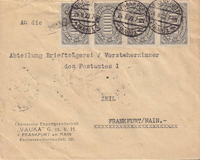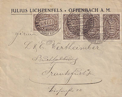 Ortsbrief (21-100 g) vom 30.08.1923 frankiert mit 4 Marken a 3 000 Mark (=12 000 Mark) |
