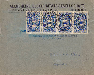 Ortsbrief (1-20 g) vom 27.08.1923 frankiert mit 4 Marken a 2 000 Mark (=8 000 Mark) |