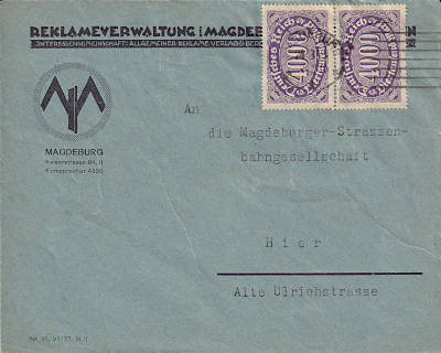 Ortsbrief (1-20 g) vom 31.08.1923 frankiert mit 20 Marken a 400 Mark (=8 000 Mark) |