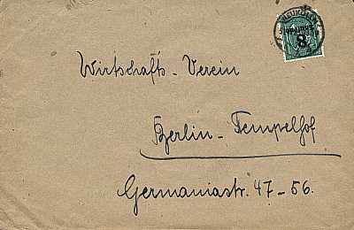 Ortsbrief (21-100 g) vom 29.08.1923 frankiert mit 3 Marken a 4 000 Mark (=12 000 Mark) |