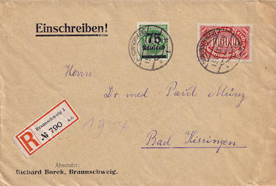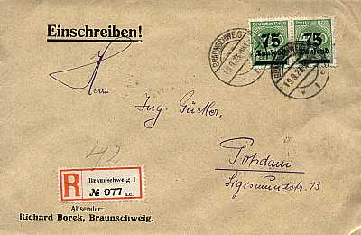 Inlandsbrief mit Einschreiben (1-20 g) vom 19.09.1923 frankiert mit 2 Marken a 75 000 Mark auf 400 Mark (=150 000 Mark, 75 000 Brief 75 000 Einschreiben) |
