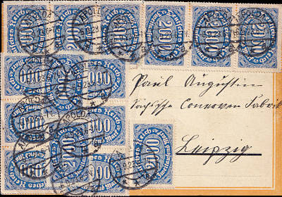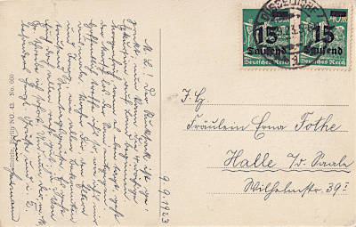 Inlandspostkarte vom 10.09.1923 frankiert mit 2 Marken a 15 000 Mark auf 40 Mark (=30 000 Mark) |