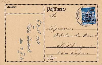 Inlandspostkarte vom 09.09.1923 frankiert mit einer Marke a 30 000 Mark auf 10 Mark (=30 000 Mark) |