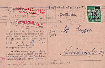 Ortspostkarte vom 03.09.1923 frankiert mit 5 Marken a 3 000 Mark (=15 000 Mark)
