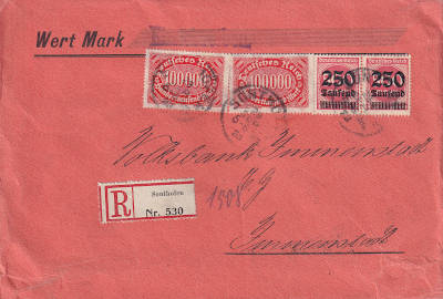 Inlandsbrief mit Einschreiben (1-20 g) vom 22.09.1923 frankiert mit 2 Marken a 250 000 Mark auf 500 Mark (=500 000 Mark, 250 000 Brief 250 000 Einschreiben) |