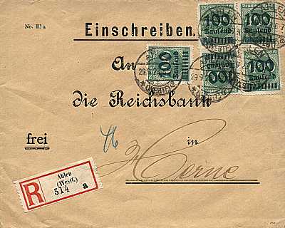 Inlandsbrief mit Einschreiben (1-20 g) vom 29.09.1923 frankiert mit 5 Marken a 100 000 Mark auf 400 Mark (=500 000 Mark, 250 000 Brief 250 000 Einschreiben) |