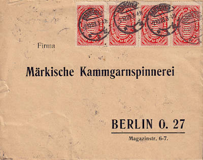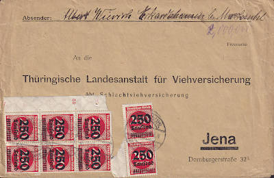 Inlandsbrief (1-20 g) vom 01.10.1923 frankiert mit 8 Marken a 250 000 Mark auf 500 Mark (=2 Millionen Mark) |