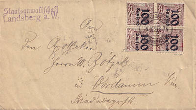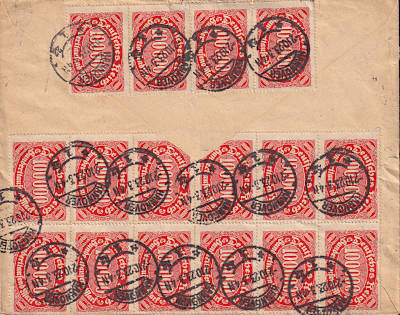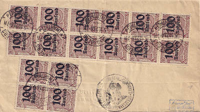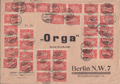 Inlandsbrief (101-250 g) vom 06.10.1923 frankiert mit 32 Marken a 100 000 Mark (=3,2 Millionen Mark) |