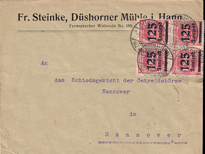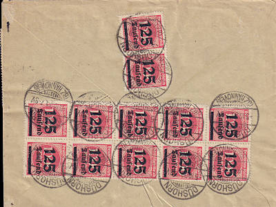 Inlandsbrief (1-20 g) vom 05.10.1923 frankiert mit 16 Marken a 125 000 Mark auf 1 000 Mark (=2 Millionen Mark) |