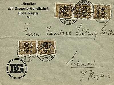 Inlandsbrief (1-20 g) vom 04.10.1923 frankiert mit 5 Marken a 400 000 Mark auf 30 Pfennig (=2 Millionen Mark) |