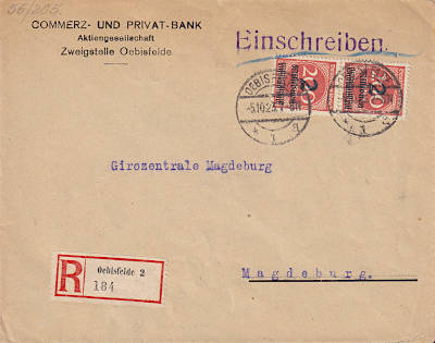 Inlandsbrief mit Einschreiben (1-20 g) vom 08.10.1923 frankiert mit 2 Marken a 2 Millionen Mark auf 5 000 Mark (=4 Millionen Mark, 2 Millionen Brief 2 Millionen Einschreiben) |