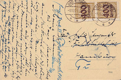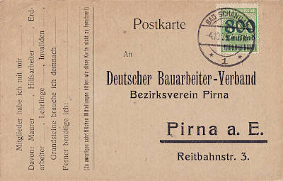 Inlandspostkarte vom 08.10.1923 frankiert mit 2 Marken a 400 000 Mark auf 25 Pfennig (=800 000 Mark) |