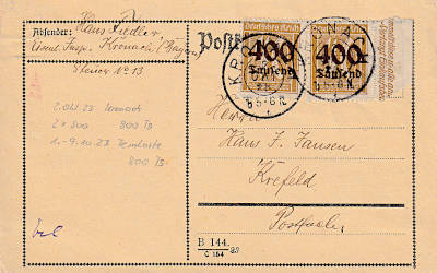 Inlandspostkarte vom 02.10.1923 frankiert mit 2 Marken a 400 000 Mark auf 40 Pfennig (=800 000 Mark) |