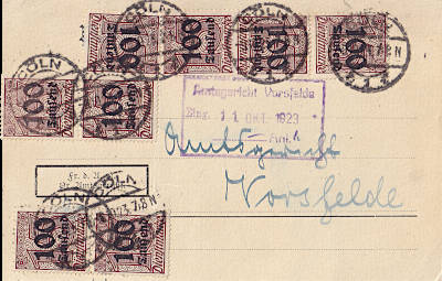Inlandspostkarte vom 02.10.1923 frankiert mit 8 Marken a 100 000 Mark auf 400 Mark (=800 000 Mark) |