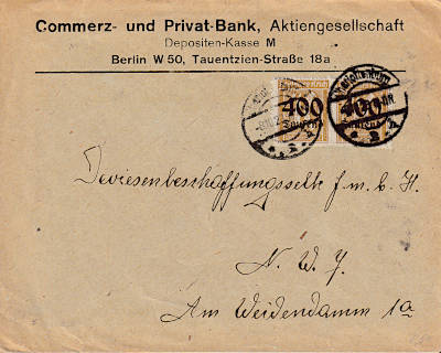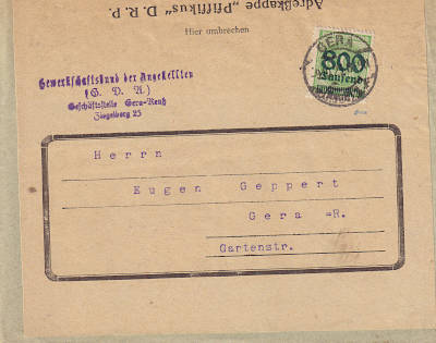 Ortsbrief (1-20 g) vom 01.10.1923 frankiert mit einer Marke a 800 000 Mark auf 10 Pfennig (=800 000 Mark) |