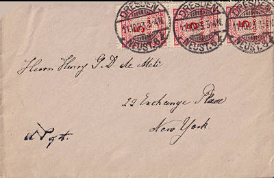 Auslandsbrief (1-20 g) vom 11.10.1923 frankiert mit 3 Marken a 5 Millionen Mark (=15 Millionen Mark)