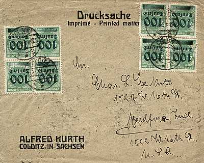 Auslandsdrucksache (1-50 g) vom 13.10.1923 frankiert mit 30 Marken a 100 000 Mark auf 400 Mark (=3 Millionen Mark)