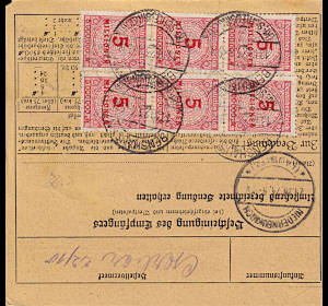 Inlandspaketkarte (4 000 g, > 75 km) vom 18.10.1923 frankiert mit 8 Marken (=36 Millionen Mark)