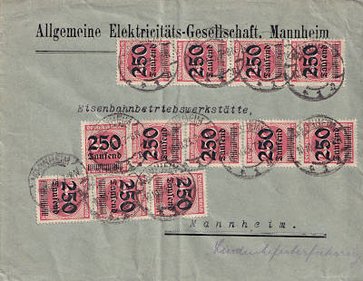Ortsbrief (21-100 g) vom 10.10.1923 frankiert mit 12 Marken a 250 000 Mark auf 500 Mark (=3 Millionen Mark)