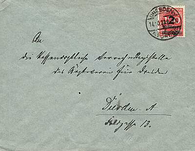 Ortsbrief (1-20 g) vom 17.10.1923 frankiert mit einer Marke a 2 Millionen Mark auf 500 Mark (=2 Millionen Mark)